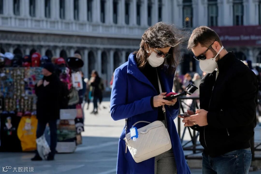 意大利威尼斯,戴口罩、包上挂净手液的游客。图源:路透社