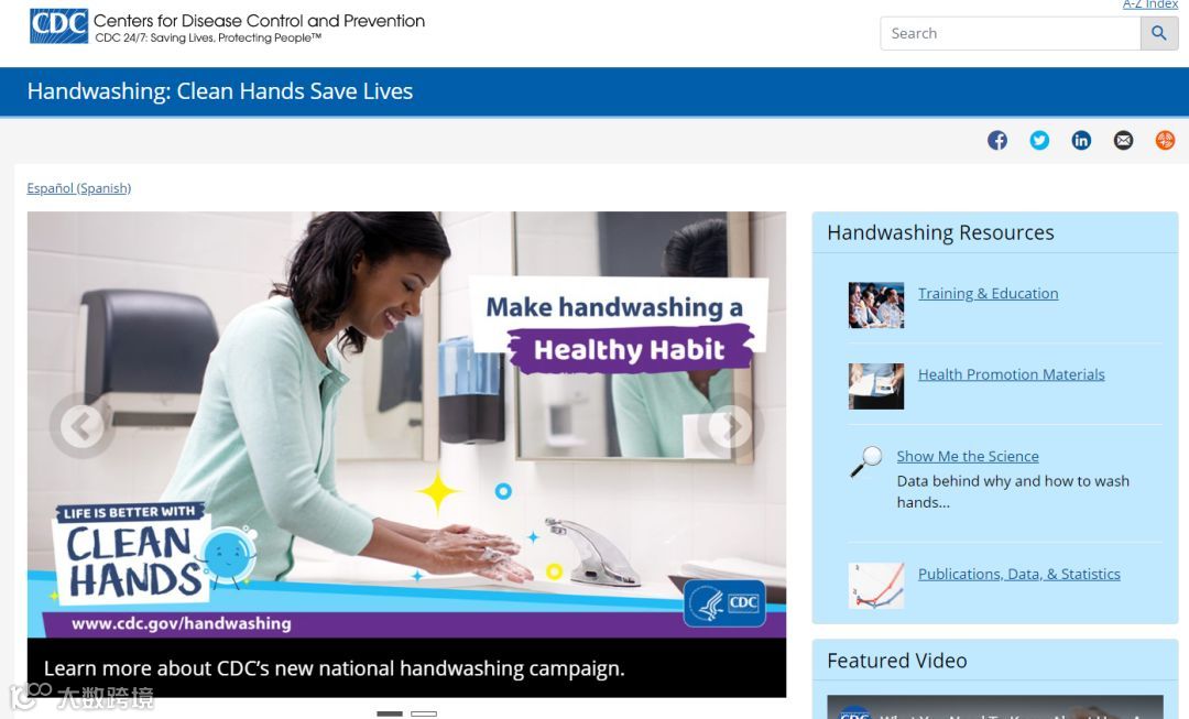 和其他一些欧美国家一样,美国非常强调手部卫生。美国疾控中心官网上,还有个专门讲洗手的网站,写着“洗手能救命”(clean hands save lives)。