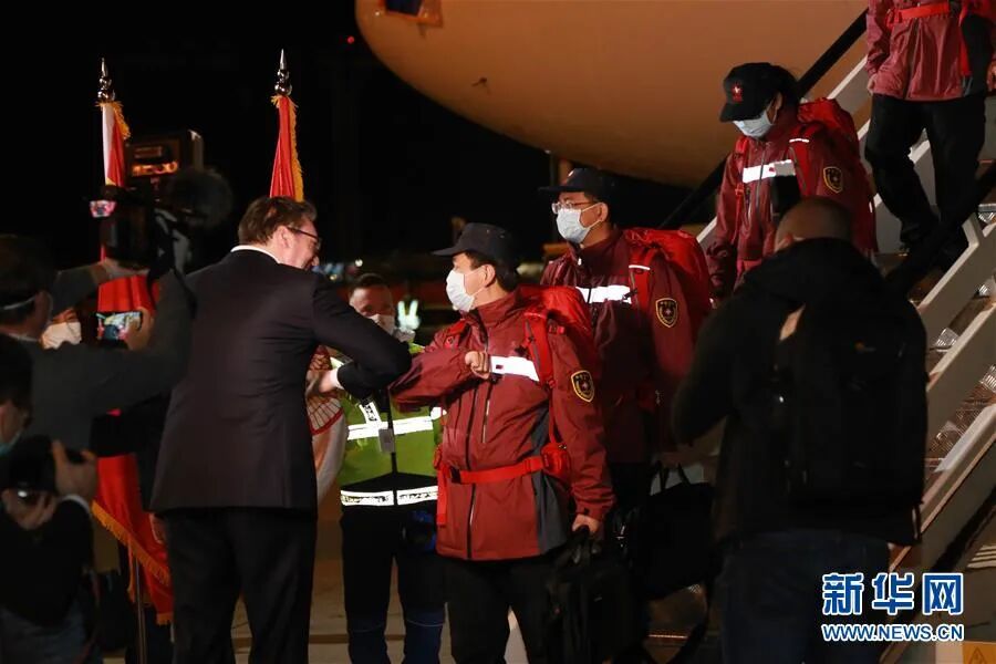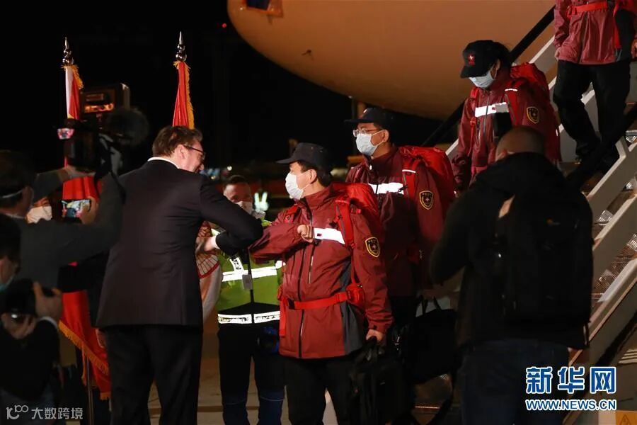 塞尔维亚总统武契奇、卫生部长、国防部长等多位政府官员在停机坪等候,武契奇与医疗队成员一一碰肘,表示热烈欢迎和由衷感谢。