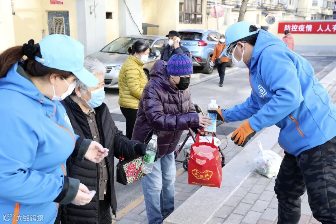 3月13日,北京市朝阳区,志愿者正在给社区居民提供消毒液 图源:中国日报网