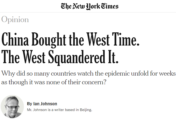 3月13日,《纽约时报》发布一篇评论员文章《中国为西方国家赢取了时间,而他们却白白浪费了》。