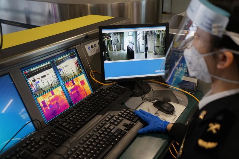 广州海关所属广州白云机场海关关员在T2航站楼运用红外线智能体温检测通道对入境旅客实施“一对一”精准测温 摄影:吕尔