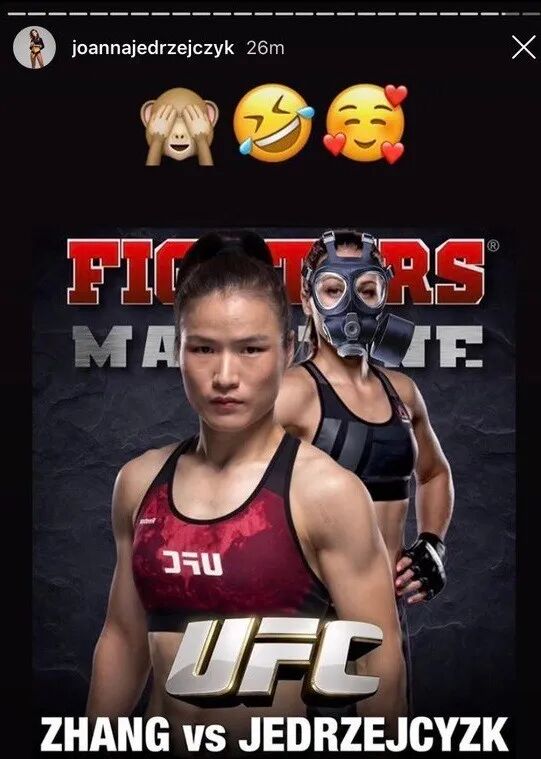 Jedrzejczyk started things off with a post of a fan-made meme on her Instagram story. The graphic showed a poster of the two fighters, with Jedrzejczyk edited to be wearing a gas mask. Three emojis, one of them laughing, sat atop the graphic.