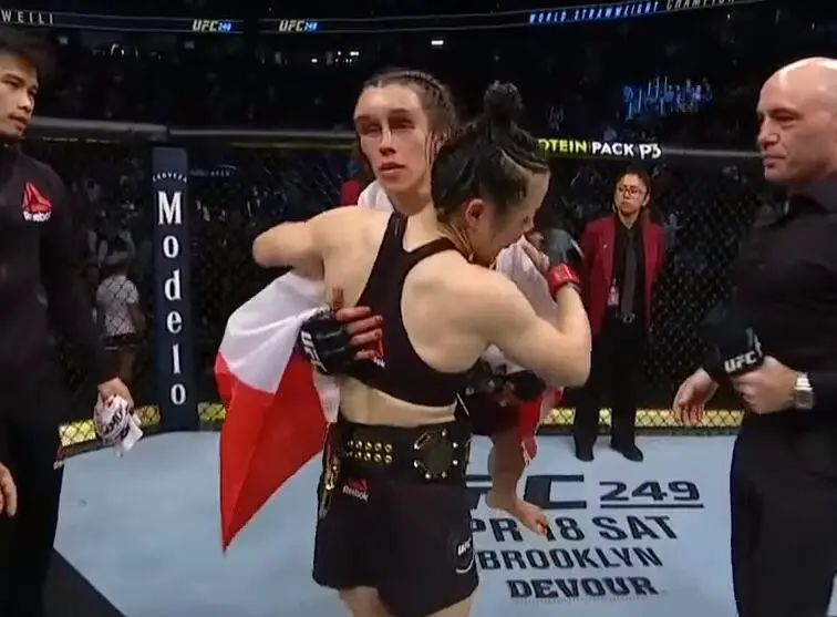 在拉斯维加斯现场观众的欢呼声中,张伟丽获得两名裁判的48∶47的打分,乔安娜获得一个48∶47,中国选手卫冕了国际妇女节当天的首个UFC金腰带。