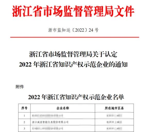 日前,浙江省市场监督管理局公布了“2022年浙江省知识产权示范企业”名单。浙江威星智能仪表股份有限公司成功入选。