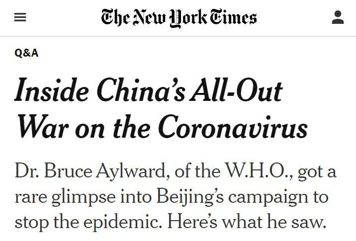 《纽约时报》:深入探访中国的全民战疫:一个难得的机会,来自世卫组织的布鲁斯·艾尔沃德得以一窥中国政府抗击疫情的行动。以下是他的所见所闻。