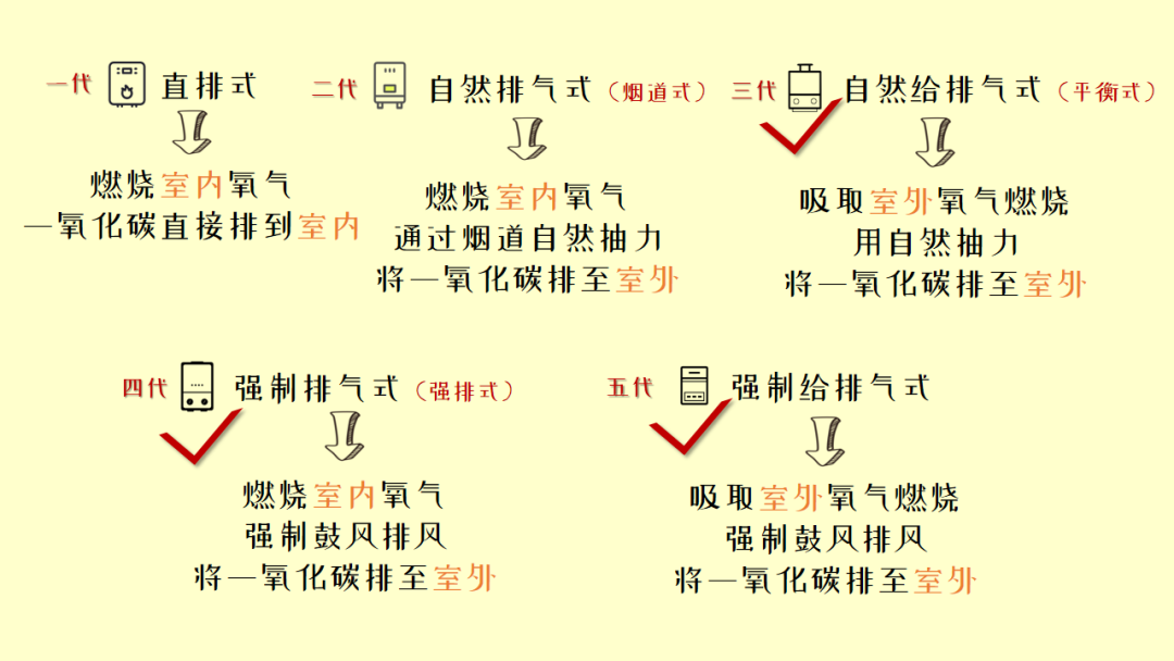 燃气热水器按照排风方式分为直排式、烟道式、平衡式、强排式与强制给排式五类。