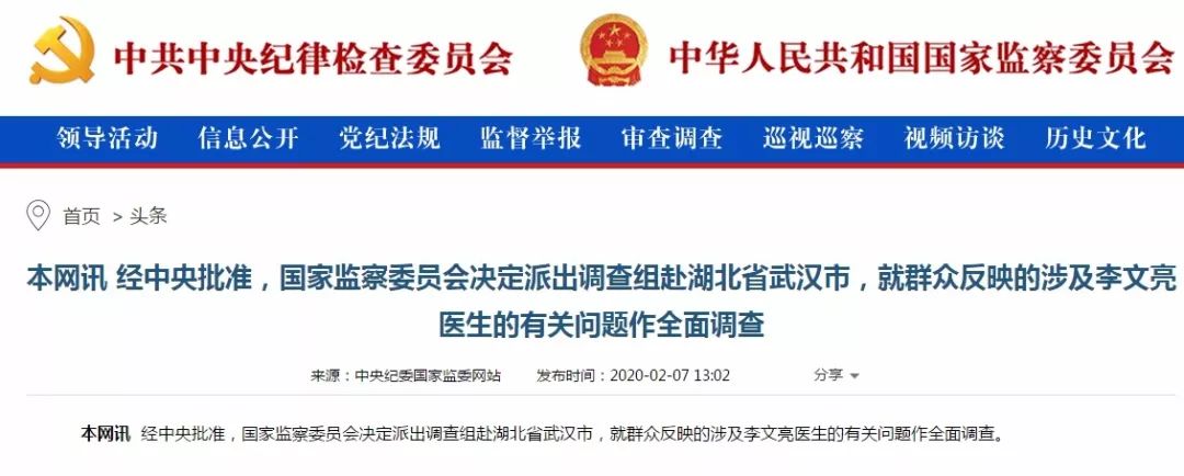 经中央批准,国家监察委员会决定派出调查组赴湖北省武汉市,就群众反映的涉及李文亮医生的有关问题作全面调查。
