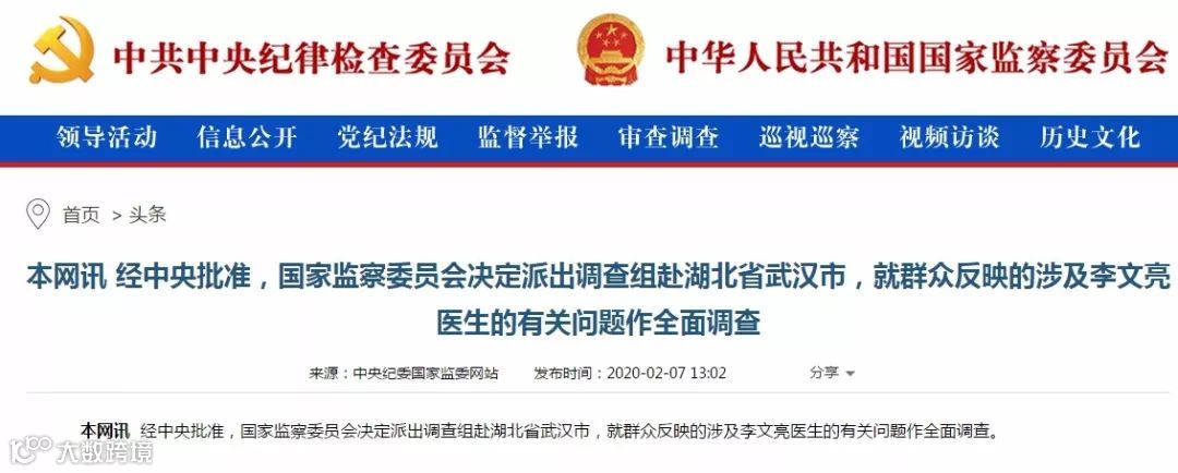 The National Supervisory Commission has decided to dispatch a team to Wuhan, Hubei province, the center of the novel coronavirus-caused pneumonia outbreak, to investigate the issues involving Li Wenliang, a doctor who died of the disease on Friday morning.