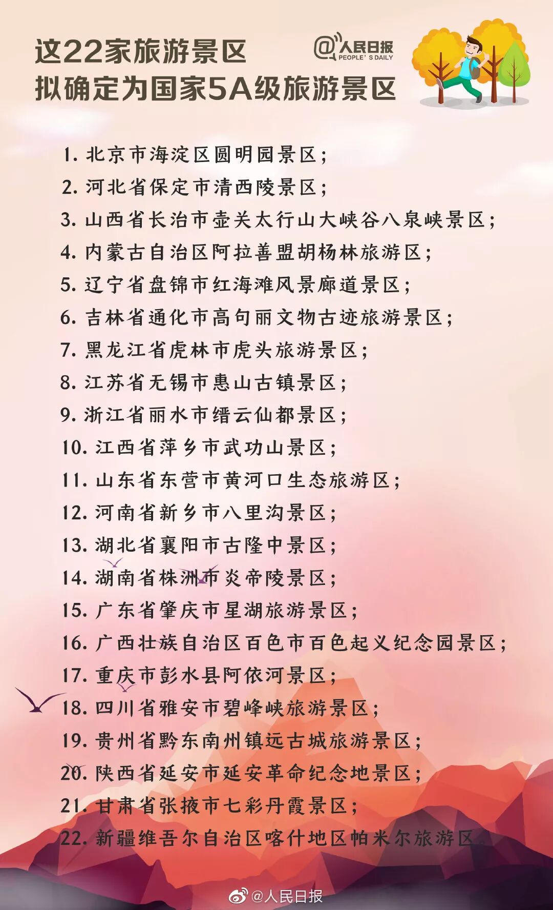 据文化和旅游部资源开发司介绍,此次22家拟新确定的5A级景区,是经有关省区市文化和旅游行政部门推荐,文化和旅游部按程序组织综合评定的。按照国家标准《旅游景区质量等级的划分与评定》和《旅游景区质量等级管理办法》,这22家旅游景区已达到国家5A级旅游景区标准要求(up to standard of 5A-level scenic areas)。
