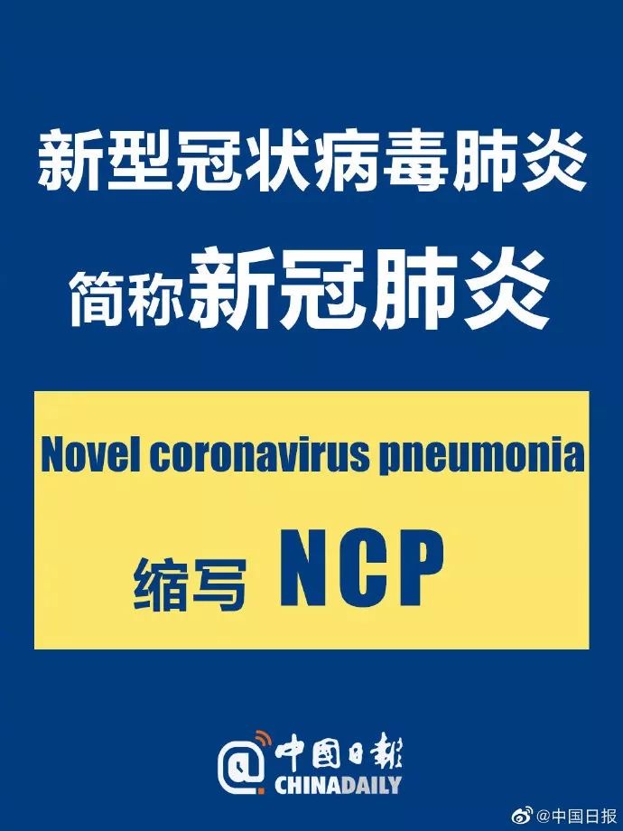 国家卫生健康委新闻发言人、宣传司司长宋树立在会上通报,国务院应对新型冠状病毒肺炎疫情联防联控机制成员现决定,将新型冠状病毒感染的肺炎暂命名为“新型冠状病毒肺炎”,英文名为“Novel coronavirus pneumonia”,简称“新冠肺炎”,英文简称NCP。