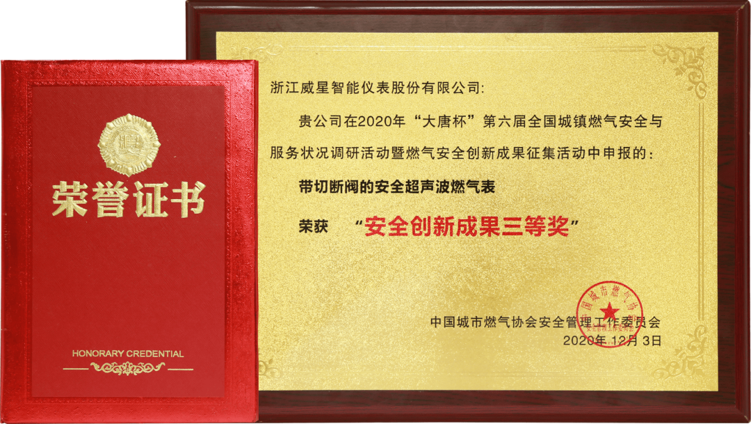 活动期间,威星智能带切断阀的安全超声波燃气表亮相燃气安全创新成果展。经过初审、专家打分、线上答辩等环节,威星智能从众多燃气运营企业、设计施工单位、设备制造商、高等院校、科研机构单位中脱颖而出,摘得“大唐杯”第六届全国城镇燃气安全创新成果三等奖。