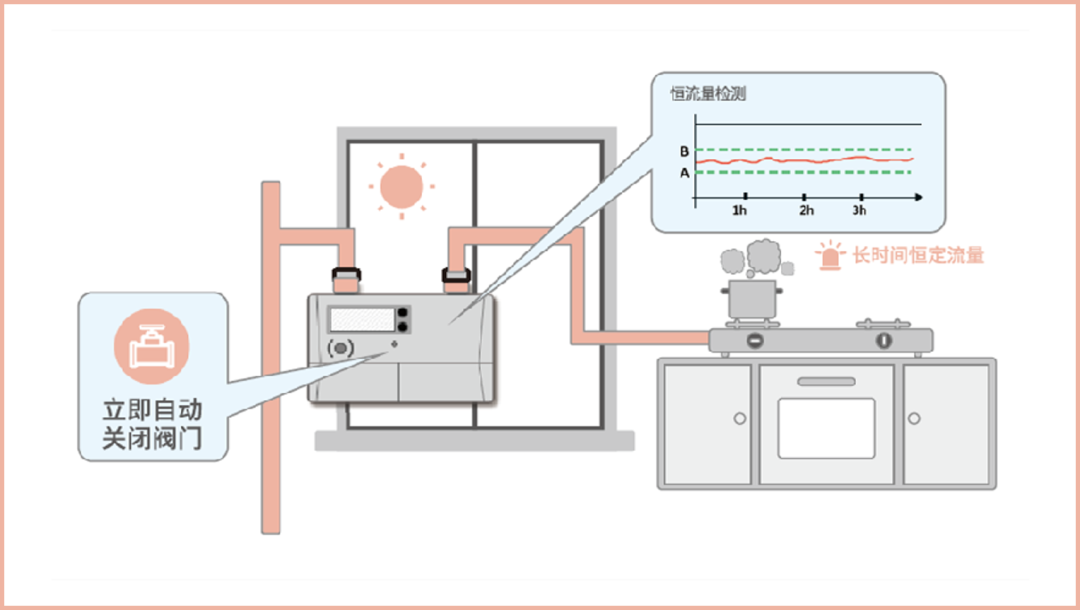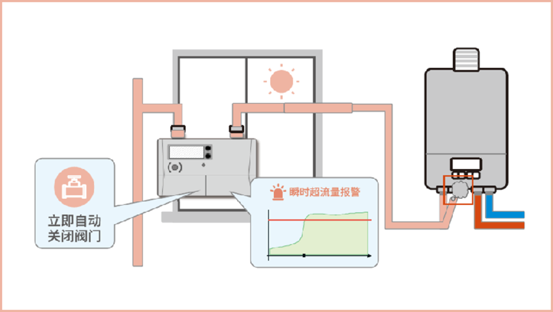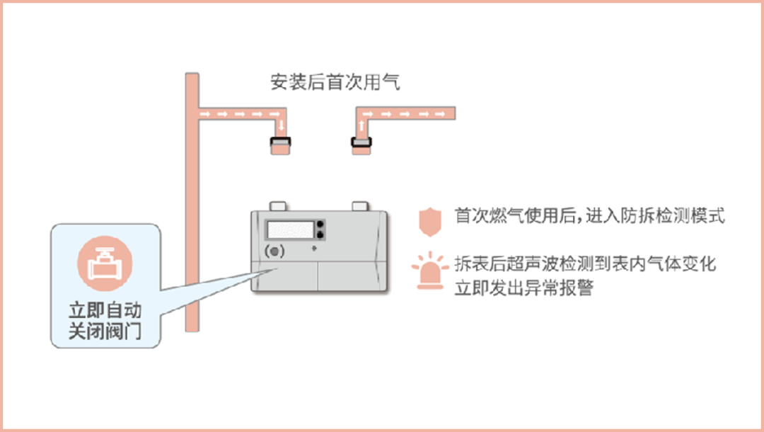 威星智能带切断阀的安全超声波燃气表可以通过对瞬时流量和管道压力的检测及时发现小流量泄漏、过流、长时间恒定流量、反向装表和非法拆表等异常用气情况,并能作出自动关阀和上报系统处理,保证用气安全。