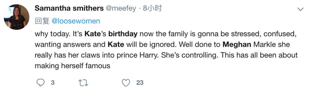 为啥非得在今天?今天是凯特的生日,结果现在全家人都面临着压力、疑惑,想要找到解决问题的答案,然后忽略了凯特。梅根真是干得漂亮,她有的是办法控制哈里王子。她就是控制欲强,所做的一切都是为了出名。