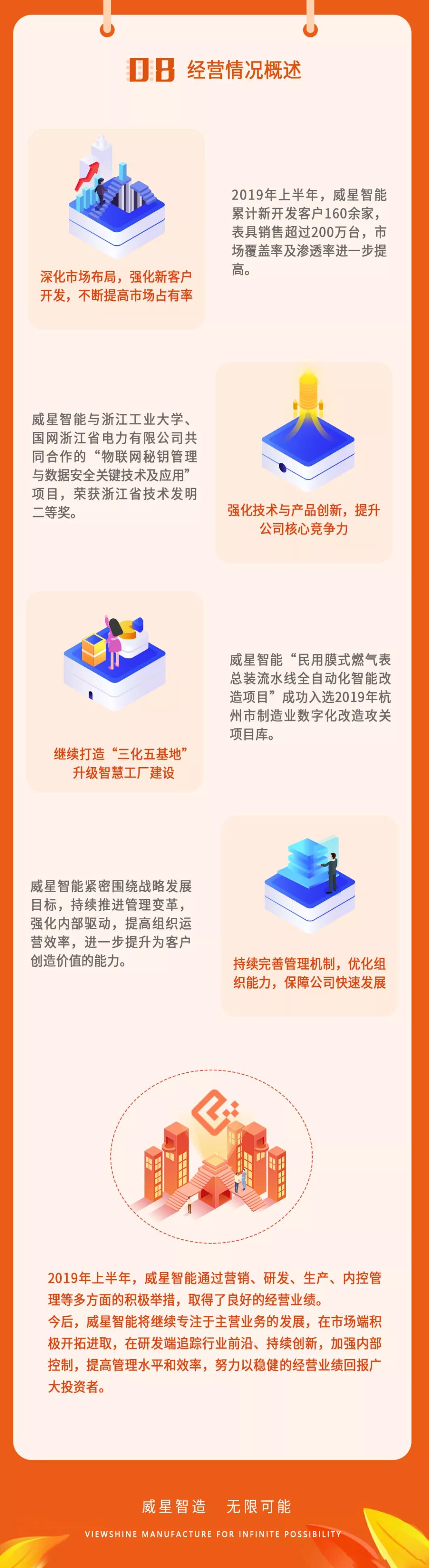 导读:2019年上半年,威星智能通过营销、研发、生产、内控管理等多方面的积极举措,取得了良好的经营业绩。