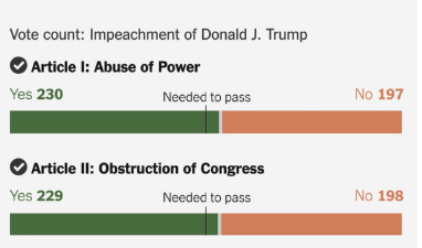 The vote was 230 to 197 for the first article of impeachment charging the president with abuse of power and 229 to 198 for the second article charging him with obstruction of Congress.