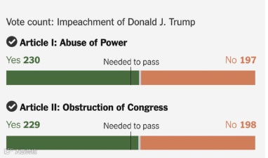 最终的票数为:第一项弹劾条款230支持,197反对;第二项弹劾条款是229支持,198反对。