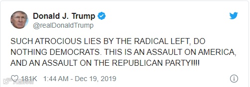 据悉,众议院正式投票通过弹劾条款后,整个弹劾程序将转至国会参议院。参议院预计将于2020年1月开始相关审理程序。