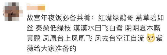 还有网友“脑补”了一份“故宫年夜饭必备菜肴”: