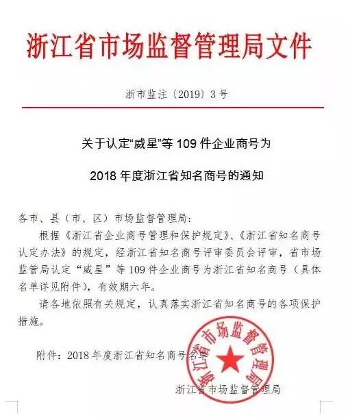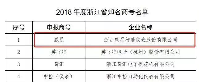 3月,省市场监督管理局发布了《关于认定“威星”等109件企业商号为2018年度浙江省知名商号的通知》,威星智能商号“威星”成功入选。