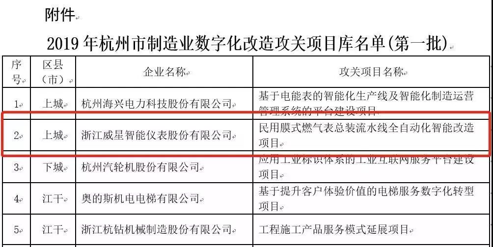 4月,威星智能凭借“民用膜式燃气表总装流水线全自动化智能改造项目”成功入选2019年杭州市制造业数字化改造攻关项目。