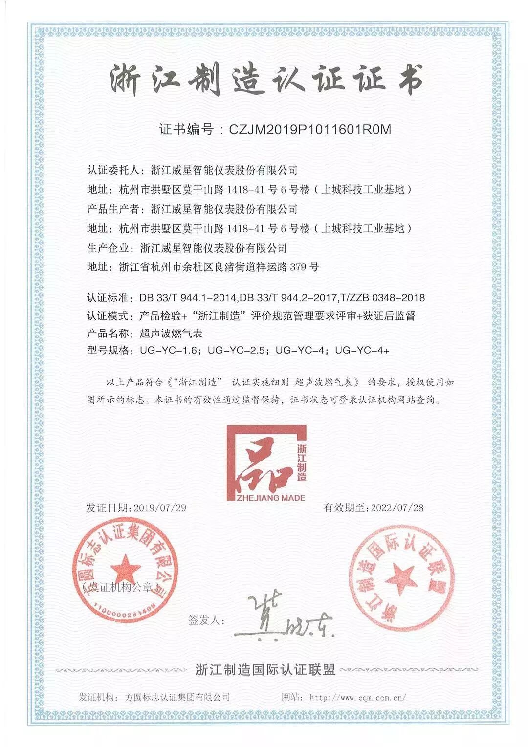 9月,威星智能超声波产品顺利获得“浙江制造”认证证书,成为了仪表行业中少数拥有“品”字标认证的品牌之一。