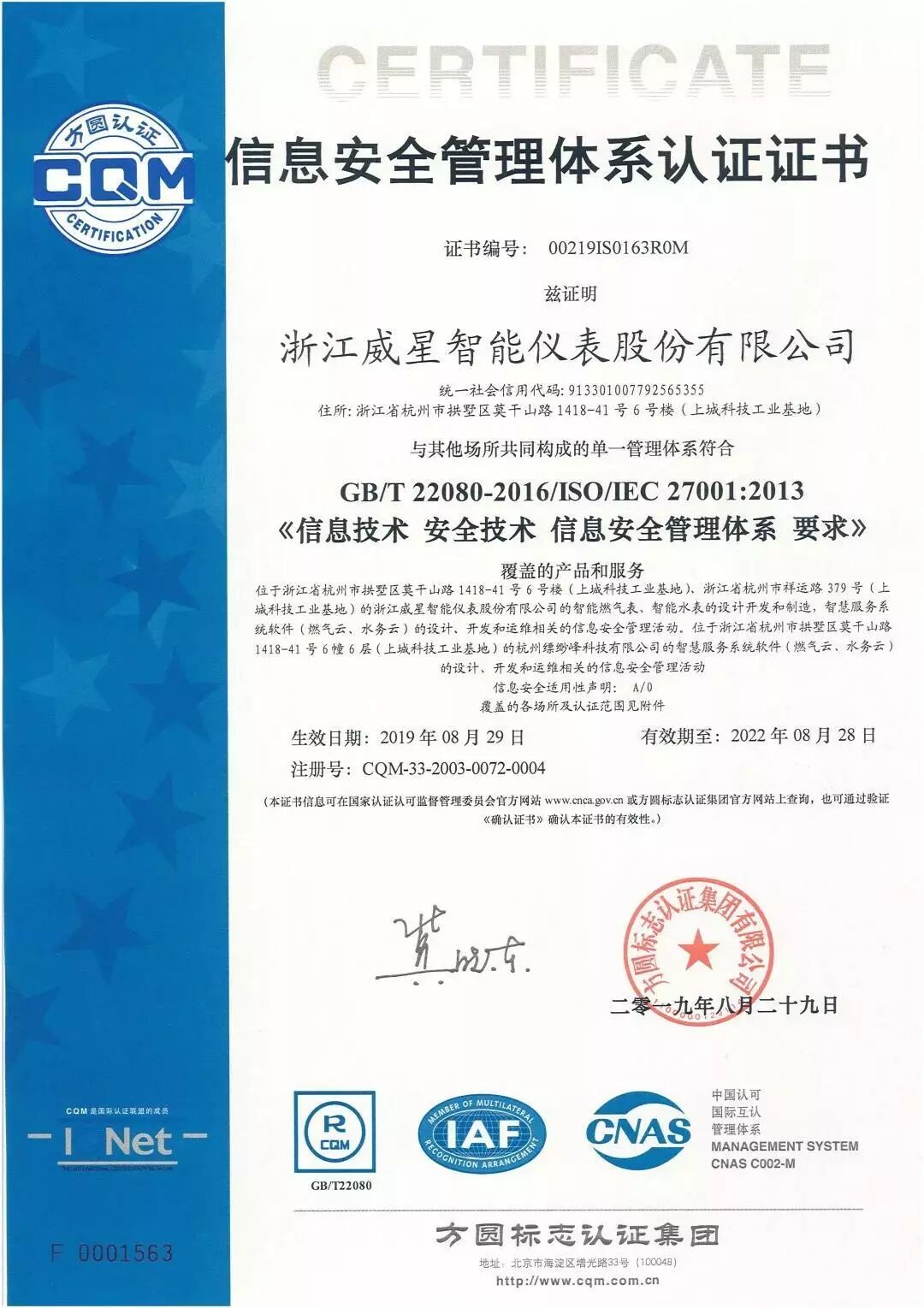 9月,威星智能通过了信息安全管理体系认证,获得了方圆标志认证集团颁发的认证证书。
