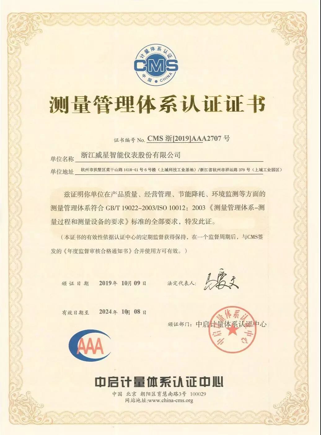 10月,威星智能在通过中启计量体系认证中心的现场认证后,顺利获得了测量管理体系(AAA) 认证证书。