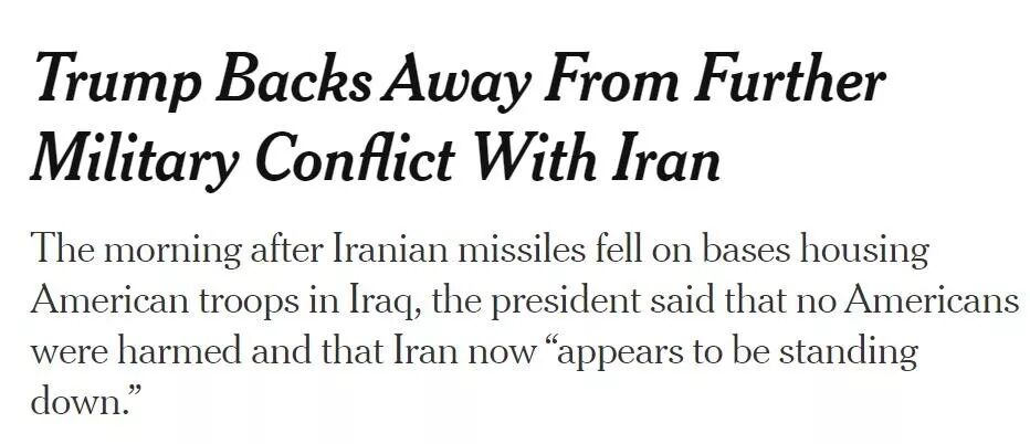 特朗普强调,在昨天伊朗的袭击中,没有美国人伤亡,所有美国士兵都很安全。美国的军事基地只是遭受轻微的损坏。