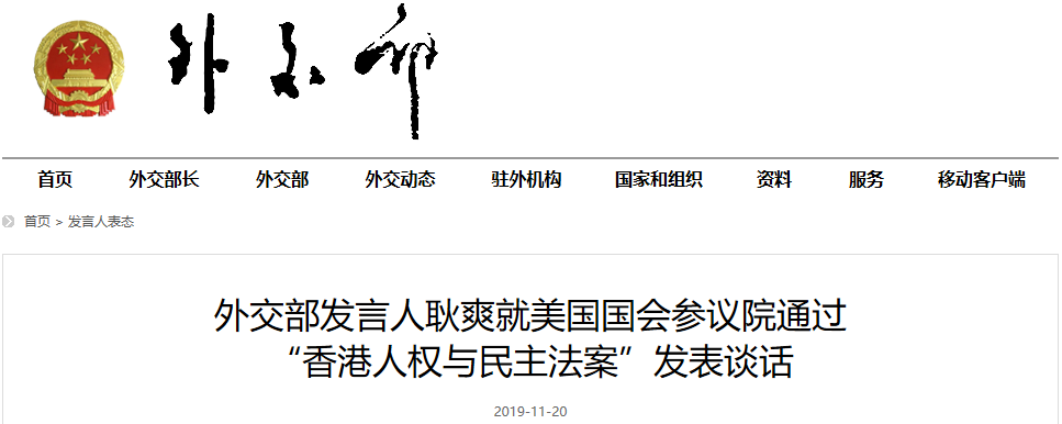On November 19, the U.S. Senate passed the Hong Kong Human Rights and Democracy Act. This act neglects facts and truth, applies double standards and blatantly interferes in Hong Kong affairs and China's other internal affairs. It is in serious violation of international law and basic norms governing international relations. China condemns and firmly opposes it.