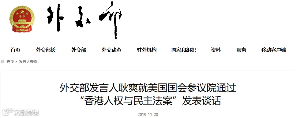 当地时间11月19日,美国参议院一致通过所谓“2019年香港人权和民主法案”,公然插手香港事务,粗暴干涉中国内政。