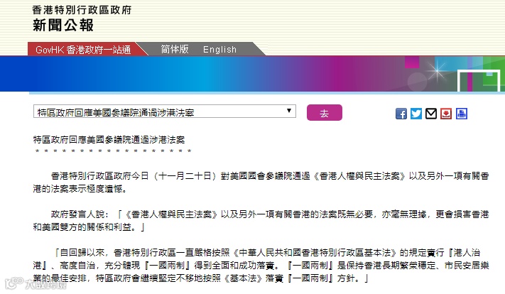 "The Hong Kong Human Rights and Democracy Act and the other act on Hong Kong are unnecessary and unwarranted. They will also harm the relations and common interests between Hong Kong and the United States," a spokesman for the HKSAR government said in a statement.