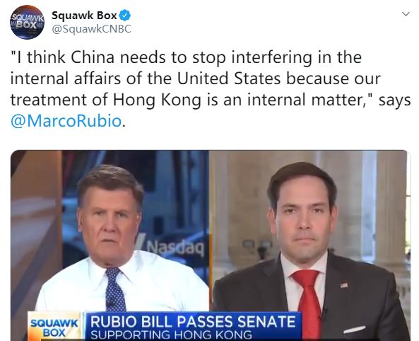 "I think China needs to stop interfering in the internal affairs of the United States because our treatment of Hong Kong is an internal matter," says Marco Rubio. 马克·卢比奥称,“我认为中国应该停止干涉美国内政,因为我们插手香港是‘内政问题’。”