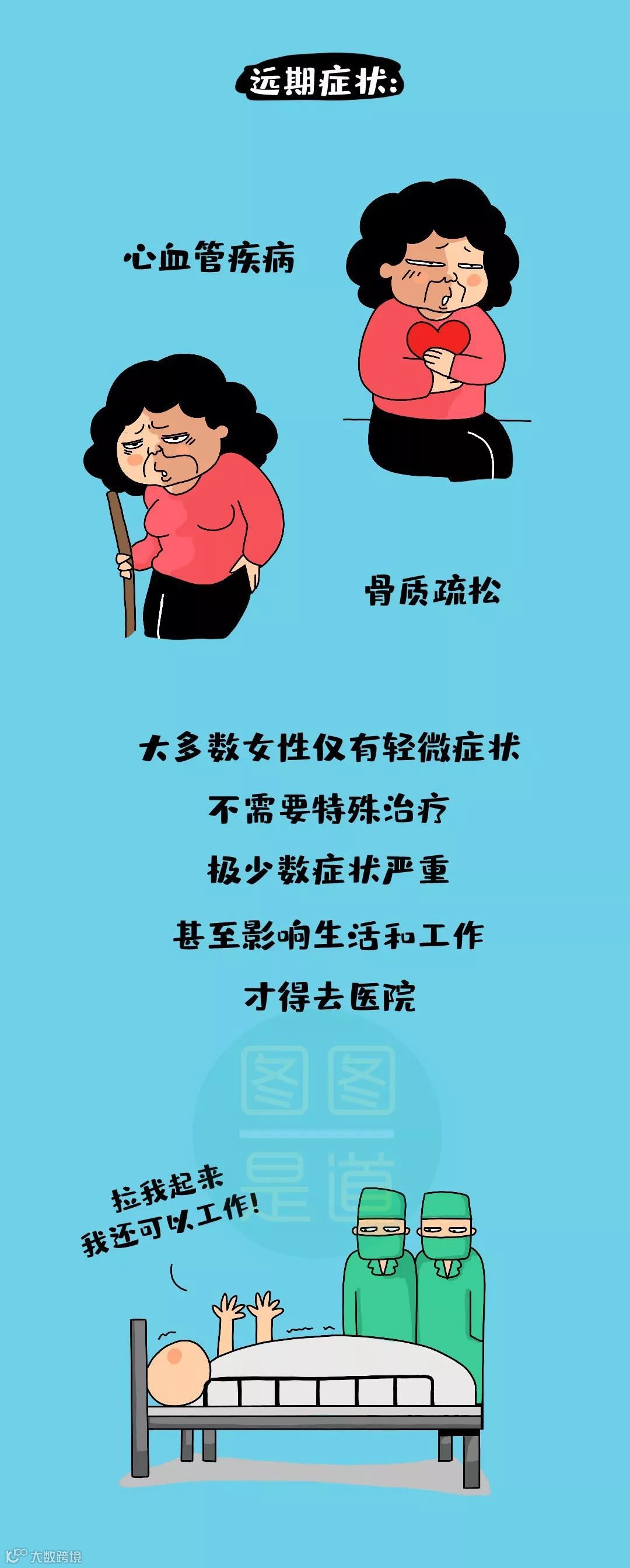 月经紊乱睡眠障碍易躁、爱发牢骚、多疑、抑郁中期症状:阴道粘膜萎缩、性交痛阴道炎尿急皮肤萎缩远期症状:骨质疏松心血管疾病大多数女性仅有轻微症状