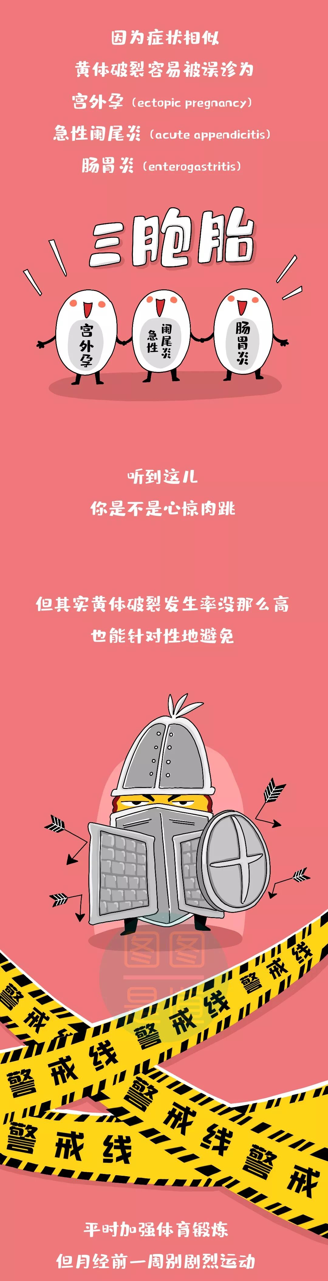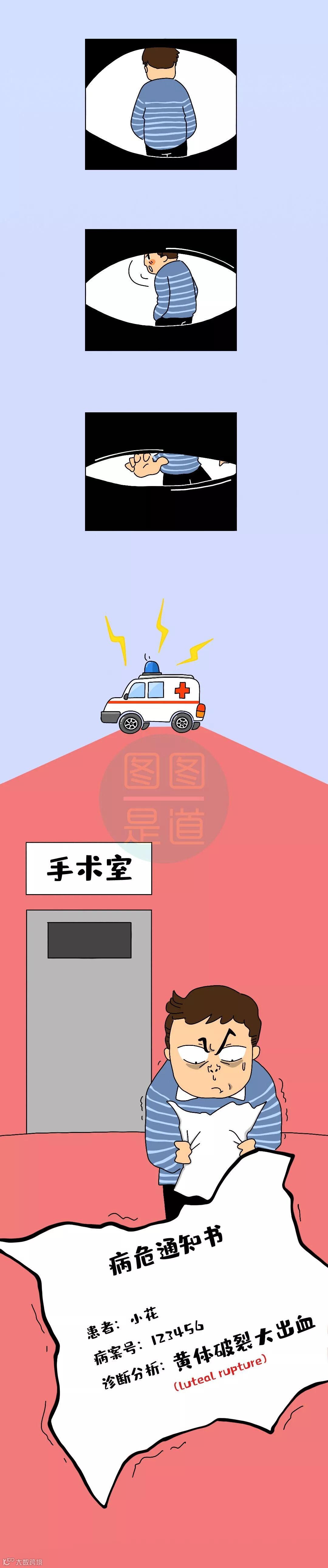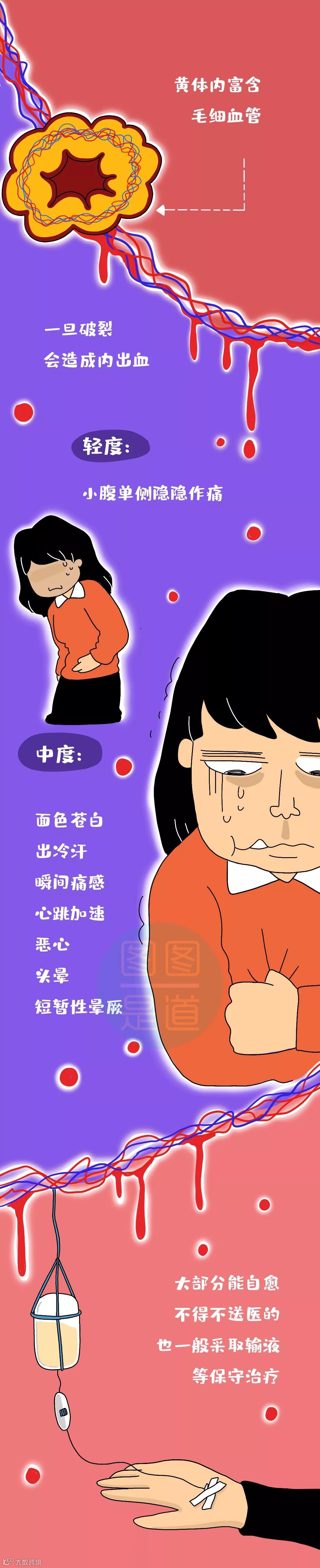 黄体内富含毛细血管一旦破裂会造成内出血轻度:小腹单侧隐隐作痛中度:面色苍白、出冷汗、瞬间痛感,心跳加速、恶心、头晕、短暂性晕厥大部分能自愈不得不送医的也一般采取输液等保守治疗重度:撕裂性疼痛、肛门坠胀感大量出血,严重时会休克需要手术止血治疗不及时会危及生命因为症状相似黄体破裂容易被误诊为宫外孕(ectopic pregnancy)、急性阑尾炎(acute appendicitis)、肠胃炎(enterogastritis)听到这儿你是不是心惊肉跳但其实黄体破裂发生率没那么高也能针对性地避免平时加强体育锻炼但月经前一周别剧烈运动爱爱时注意动作轻柔避免粗鲁、激烈的动作咳嗽、便秘会导致腹压增高如果剧烈咳嗽、严重便秘就要及时治疗也许女生上辈子是道高数题这辈子才会这么难吧~
