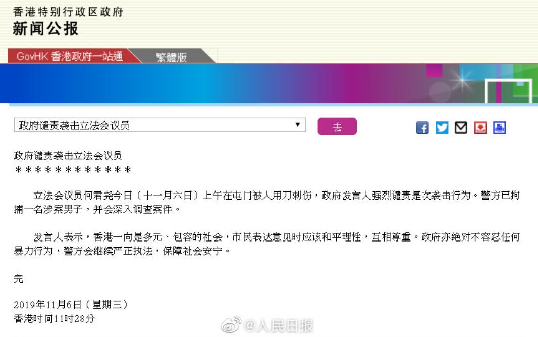 香港特区政府发声明强烈谴责这次袭击行为,并表示“警方已拘捕一名涉案男子,会深入调查案件”。特区政府发言人表示,“绝对不容忍任何暴力行为,警方会继续严正执法,保障社会安宁”。