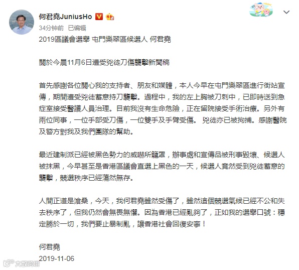 首先感谢各位关心我的支持者、朋友和媒体,本人今早在屯门乐翠区进行街站宣传,期间遭受凶徒蓄意持刀袭击。过程中,我的左上胸被刀刺中,已即时送到急症室接受医护人员治理。目前我没有生命危险,正在留院接受手术治疗。另外有两位同事,一位手部受刀伤,一位双手及手臂受伤。凶徒亦已被拘捕。感谢医院及警方对我及我们团队的帮助。