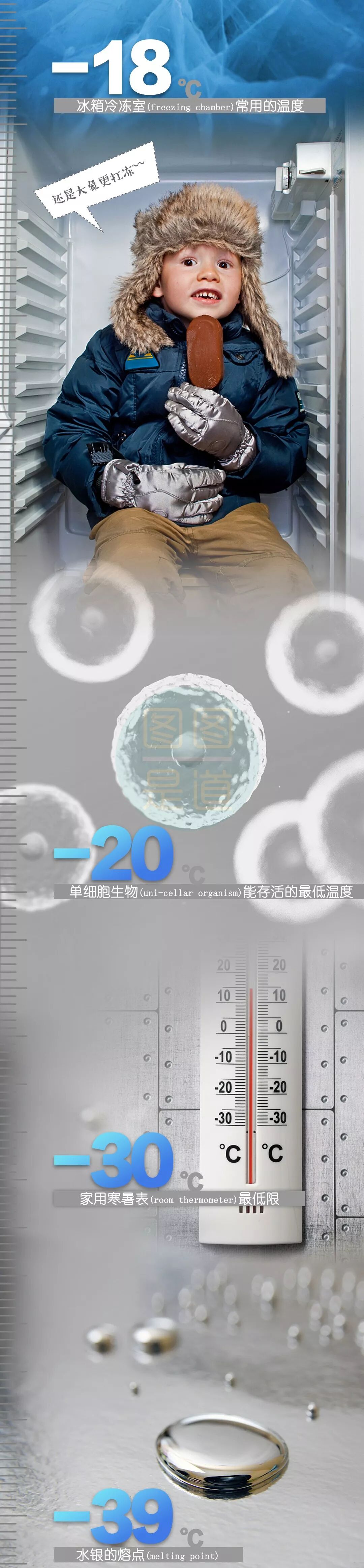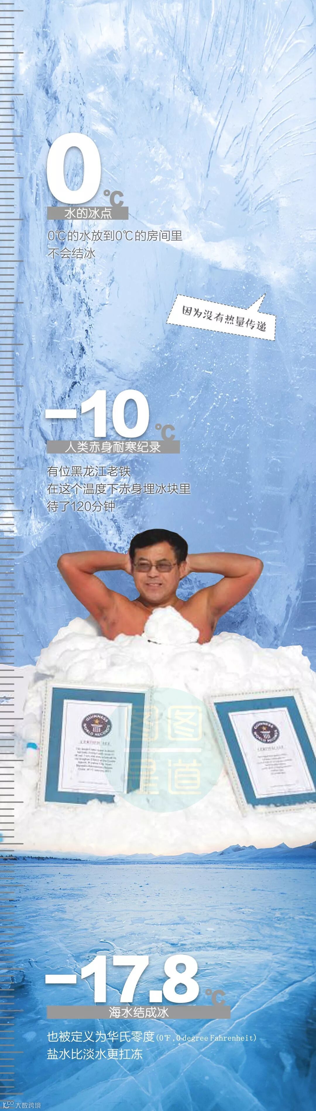 0℃ 水结成冰-10℃ 人类赤身耐寒纪录 2011年,有位黑龙江老铁在这个温度下赤身埋冰块里,待了120分钟。-17.8℃ 海水结成冰,也被定义为华氏零度(0℉, 0 Fahrenheit)-18℃ 冰箱冷冻室(freezing chamber)常用的温度大约-20℃ 单细胞生物(uni-cellar organism)能存活的最低温度-30℃ 家用寒暑表(room thermometer)最低限-39℃ 水银的熔点(melting point),固态水银见过的人可不多-40℃ 民用防冻液的最低冰点。只要你不生活在西伯利亚,基本上都够用。-58℃ 中国历史最低气温,测于内蒙古自治区根河市。-60℃ 汽油熔点都在这个温度以下。-71℃ 西伯利亚冬天最低温。你我原本没什么感情维系,全靠南下的西伯利亚冷空气。