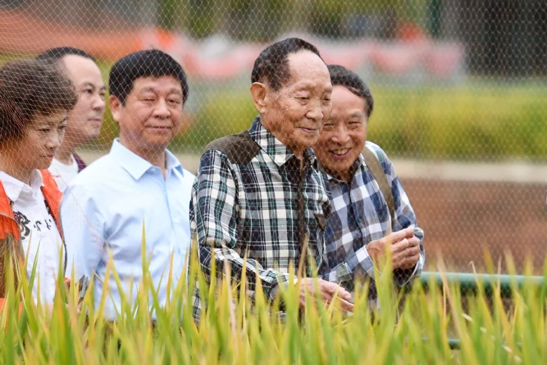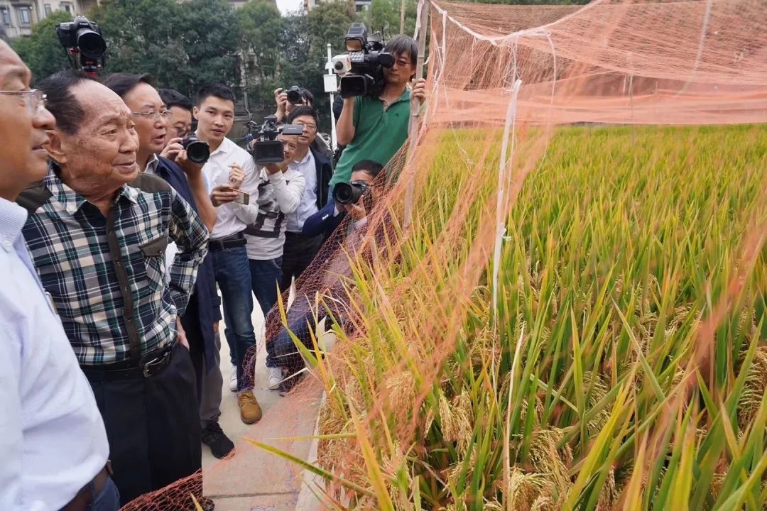 10月22日,袁隆平与测产专家组考察位于长沙的湖南杂交水稻研究中心试验示范田。图源:中新社