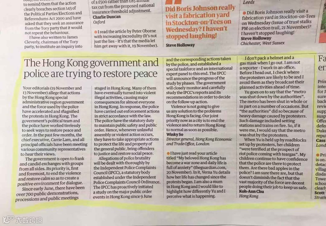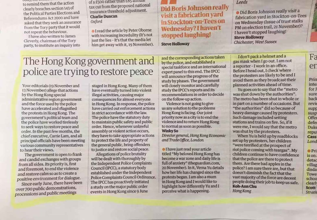 但11月22日英国《卫报》言论版6版,罕见的同时刊登两封香港女性发来的读者来信,会让您有不同的认识。