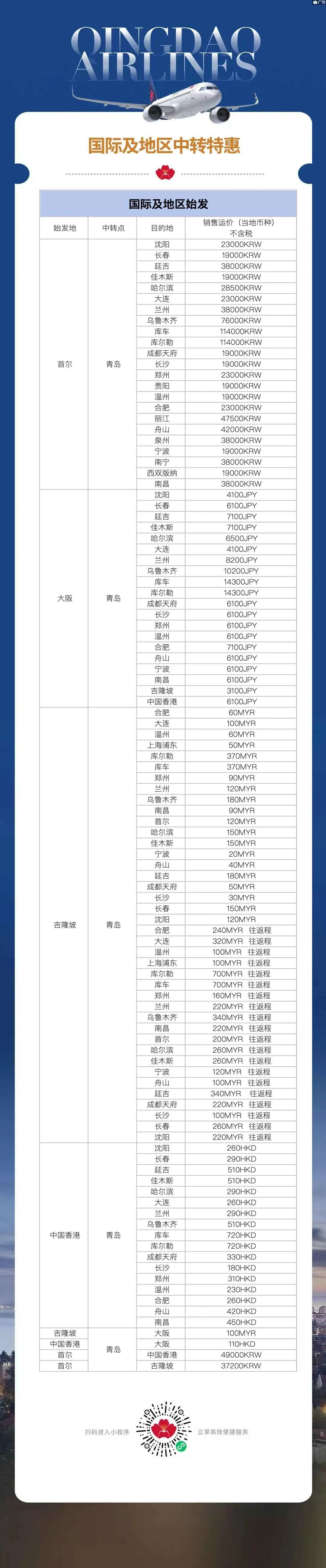 超值享受!青岛航空国际及地区航线中转特惠来了!