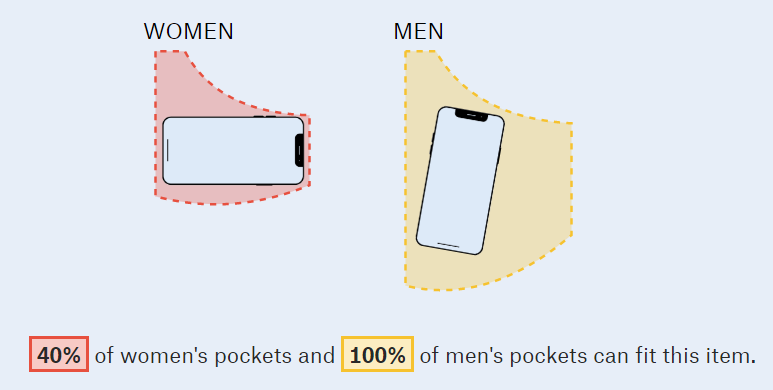 Only 40 percent of women’s front pockets can completely fit one of the three leading smartphone brands. Less than half of women’s front pockets can fit a wallet specifically designed to fit in front pockets. And you can’t even cram an average woman’s hand beyond the knuckles into the majority of women’s front pockets.