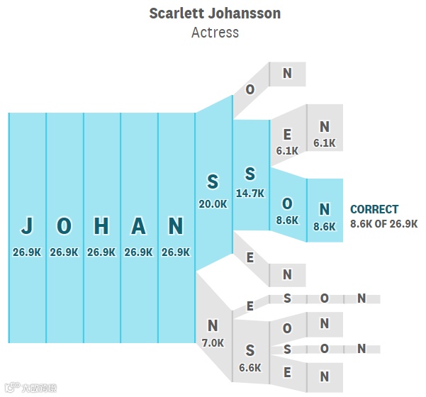 好莱坞演员斯嘉丽·约翰逊的姓Johansson在将近2万7千个答案中,只有8600人拼对了,大部分人是错在最后一个音节sson.