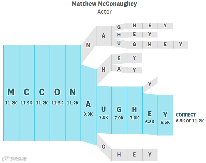 奥斯卡最佳男演员得主Mathew McConaughey的姓也是格外难拼,1万1千份答案中,只有6500人拼对了。