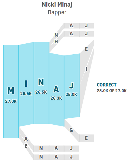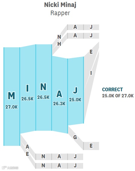 说唱歌手Nicki Minaj的名字可能是因为比较短的原因,2万7千人中有2万5千人都答对了。