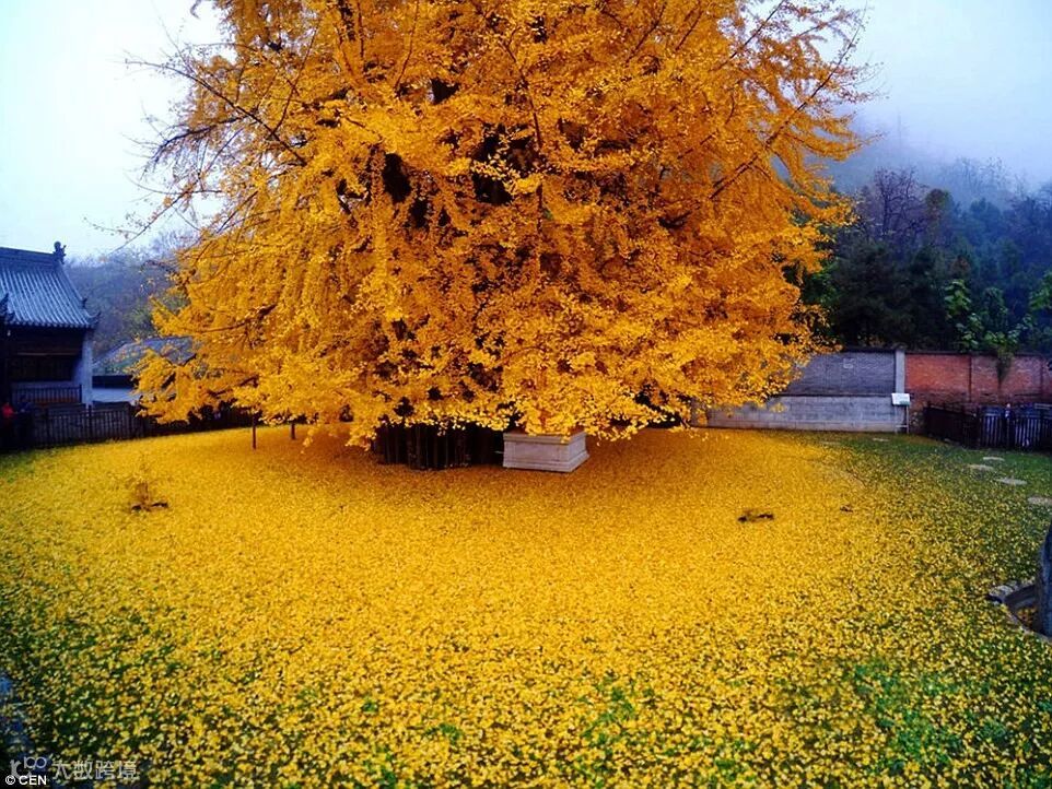 这棵古银杏的照片在社交媒体上广泛传播,满树金叶辉煌灿烂,令人惊叹。
