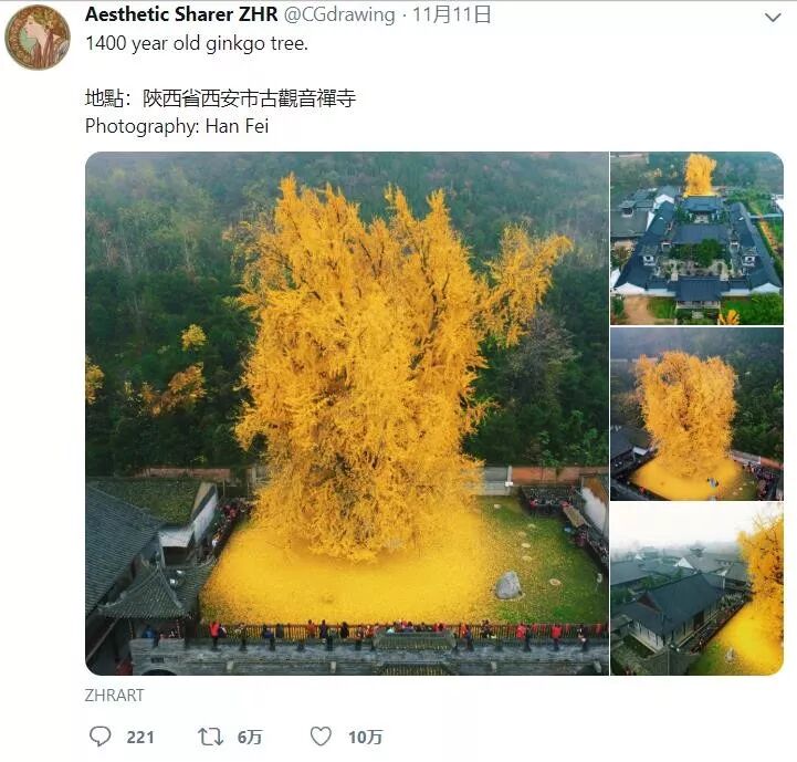 11月11日,推特用户Aesthetic Sharer ZHR@CGdrawing 在社交网络上传了古树的照片后,立刻引起轰动。截至15日,转发量已达6万次,点赞数是更是高达10万次。