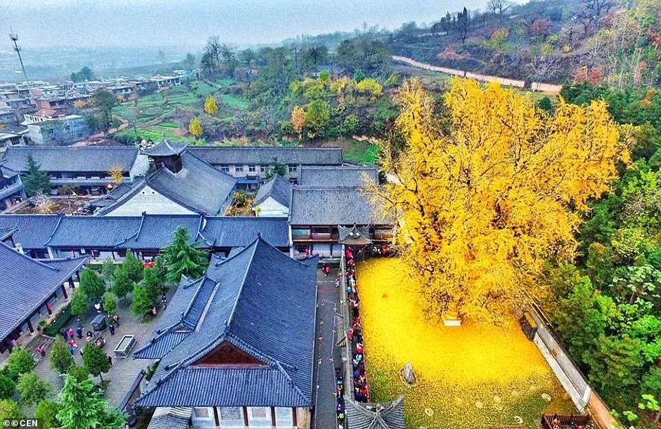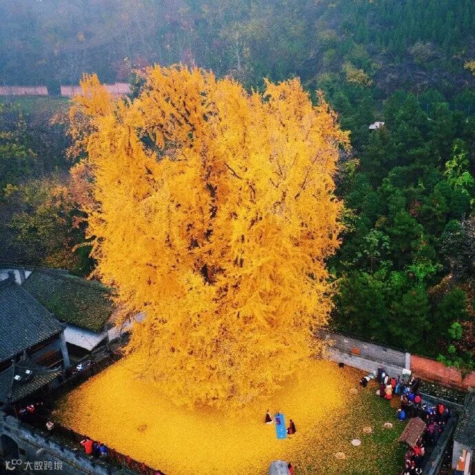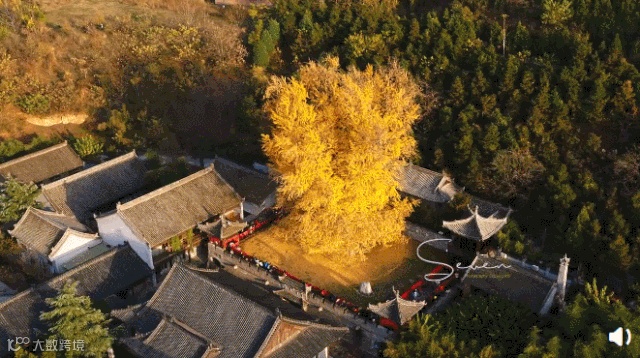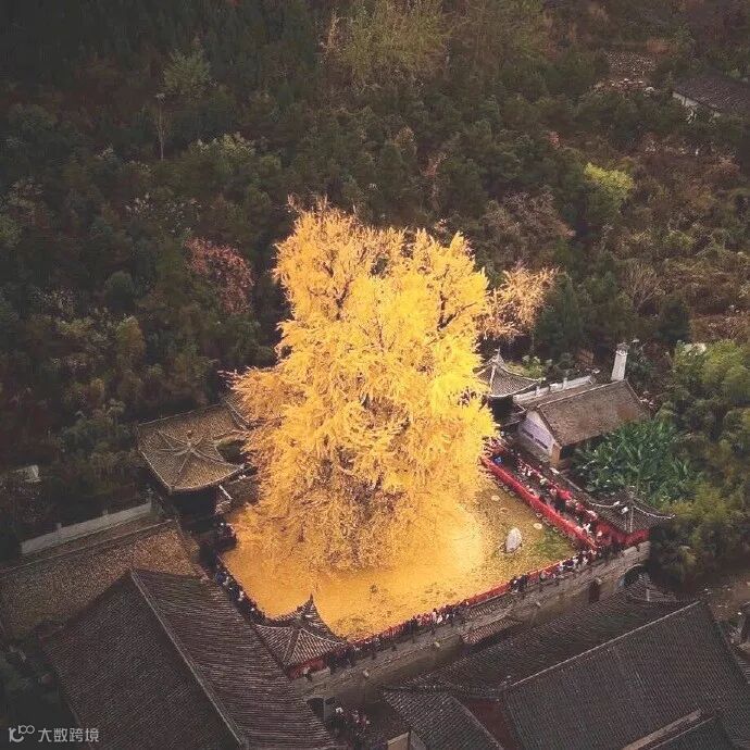 到11月中旬,银杏叶纷纷落下,成为一景。金叶散落在古树四周,从空中鸟瞰,如同一片金色地毯。