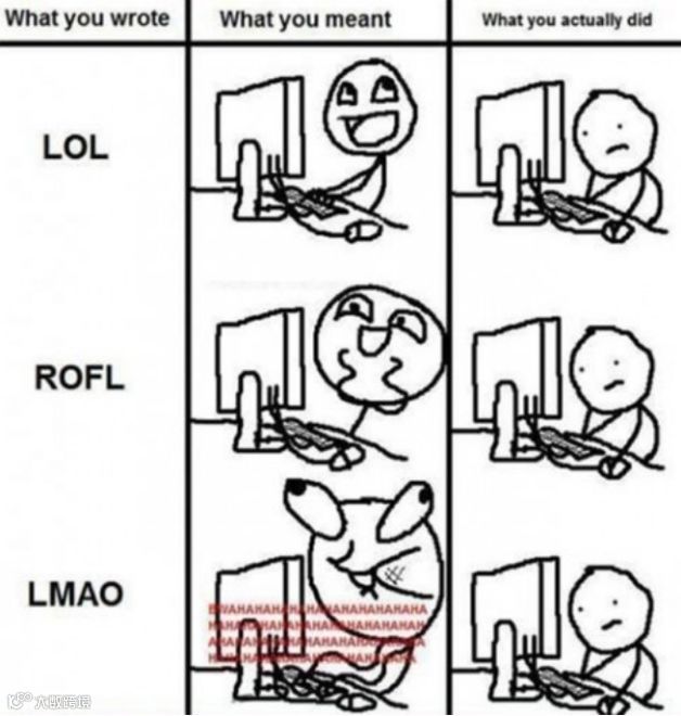 虽说lol最开始的意思是大笑,但是后来就含义丰富起来,可以表示你听到了某个笑话,或者可以用来缓解下尴尬的对话气氛。
