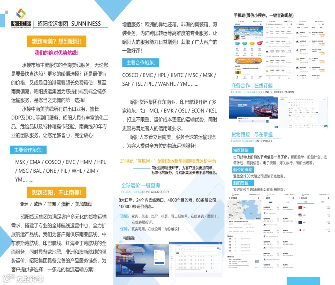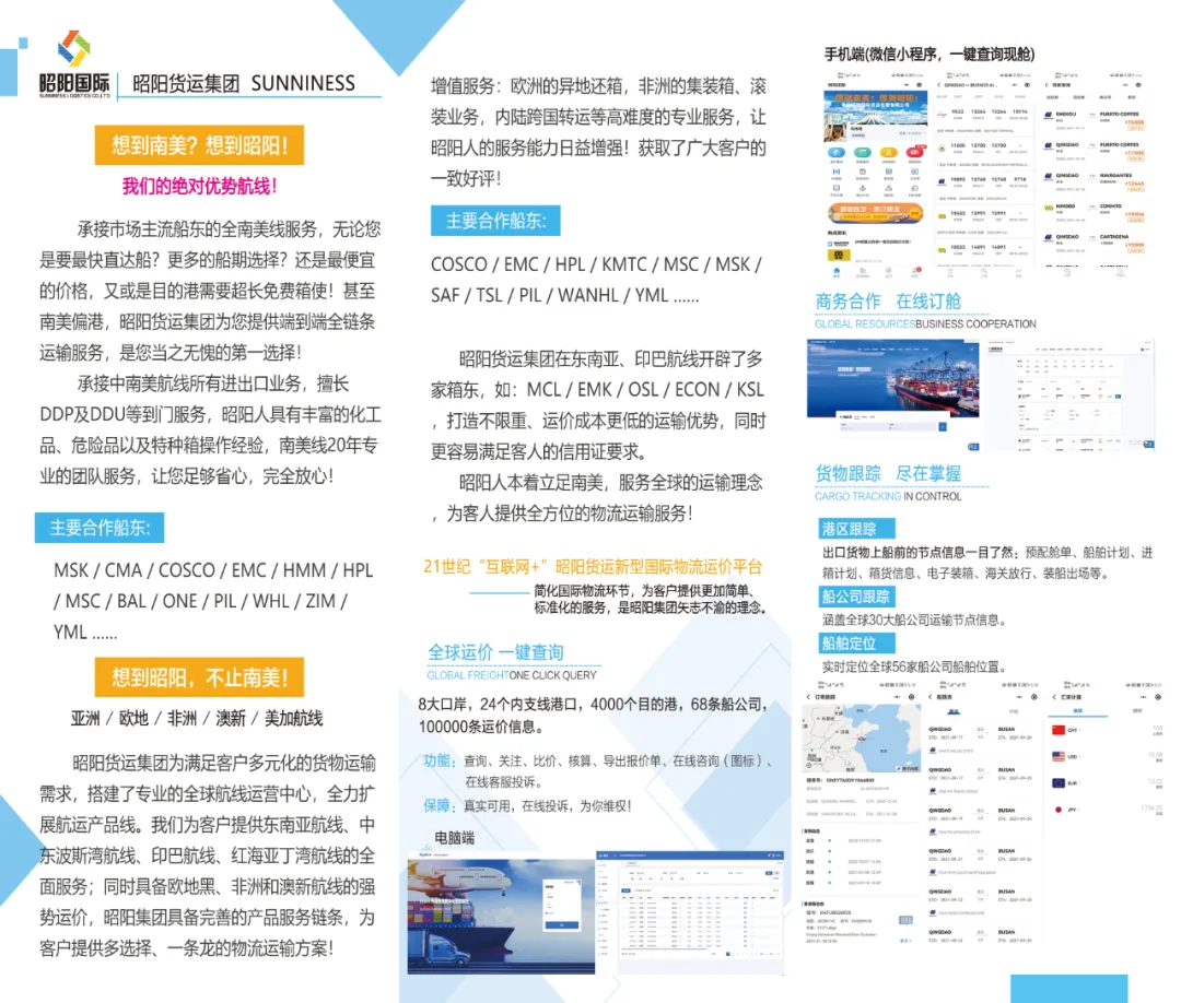 昭阳国际成立于2003年,总部位于青岛,分子公司遍布上海深圳、天津,宁波等全国主要港口及城市,可承接全国进出口货物的海运、空运、海空联运、散杂货运输等业务,并为客户提供全套的报关、商检、保险、仓储、拖车及相关服务。昭阳国际是国家经贸部批准的具有一级货运代理权的专业化现代物流企业。